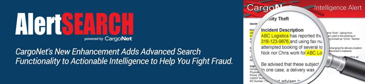 AlertSearch provides advanced search functionality to actionable intelligence within the CargoNet database. It can be utilized to directly reduce your chances of becoming a cargo theft victim. AlertSearch allows you to search CargoNet's extensive archive of alerts by any suspect name, phone number, email address, and much more. Ultimately, anything you can think of can now be searched and used to help you avoid identity theft, fictitious pickups, other transportation related scams and aide in your carrier validation efforts.